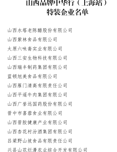 圖為山西品牌中華行(上海站)特裝企業(yè)名單
